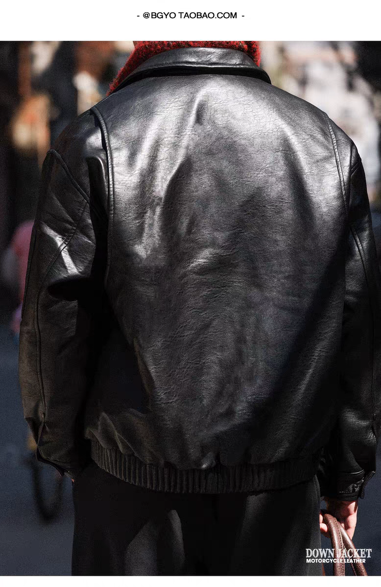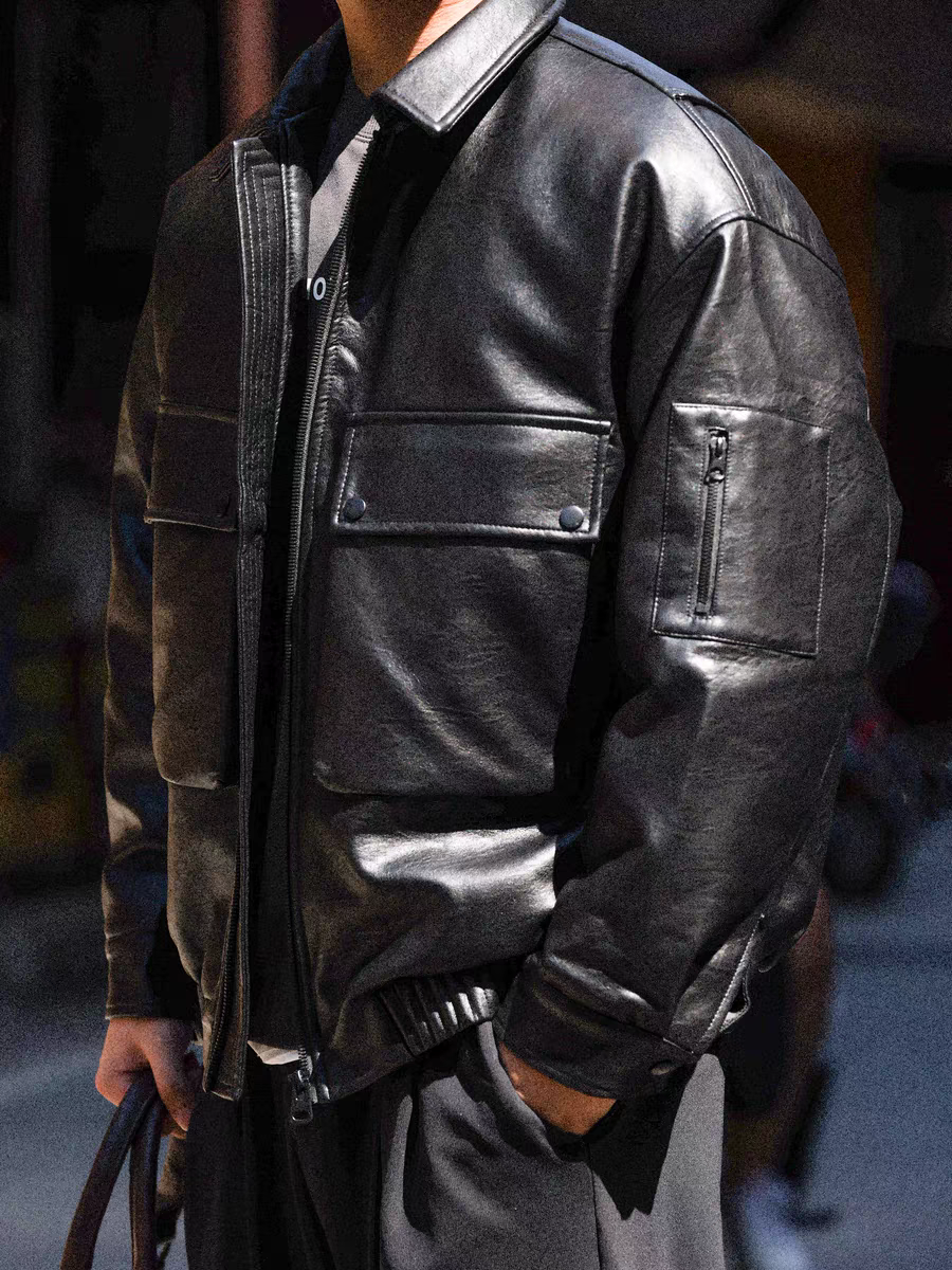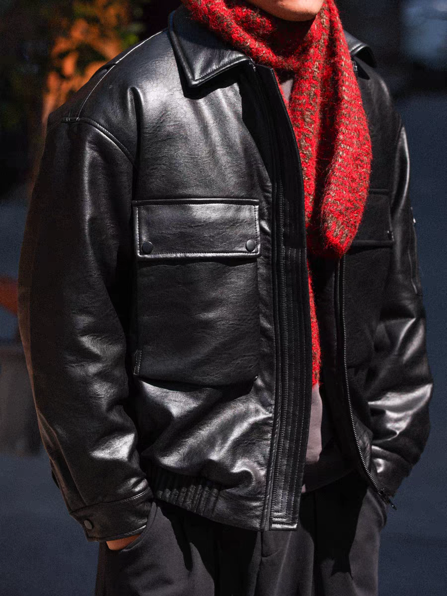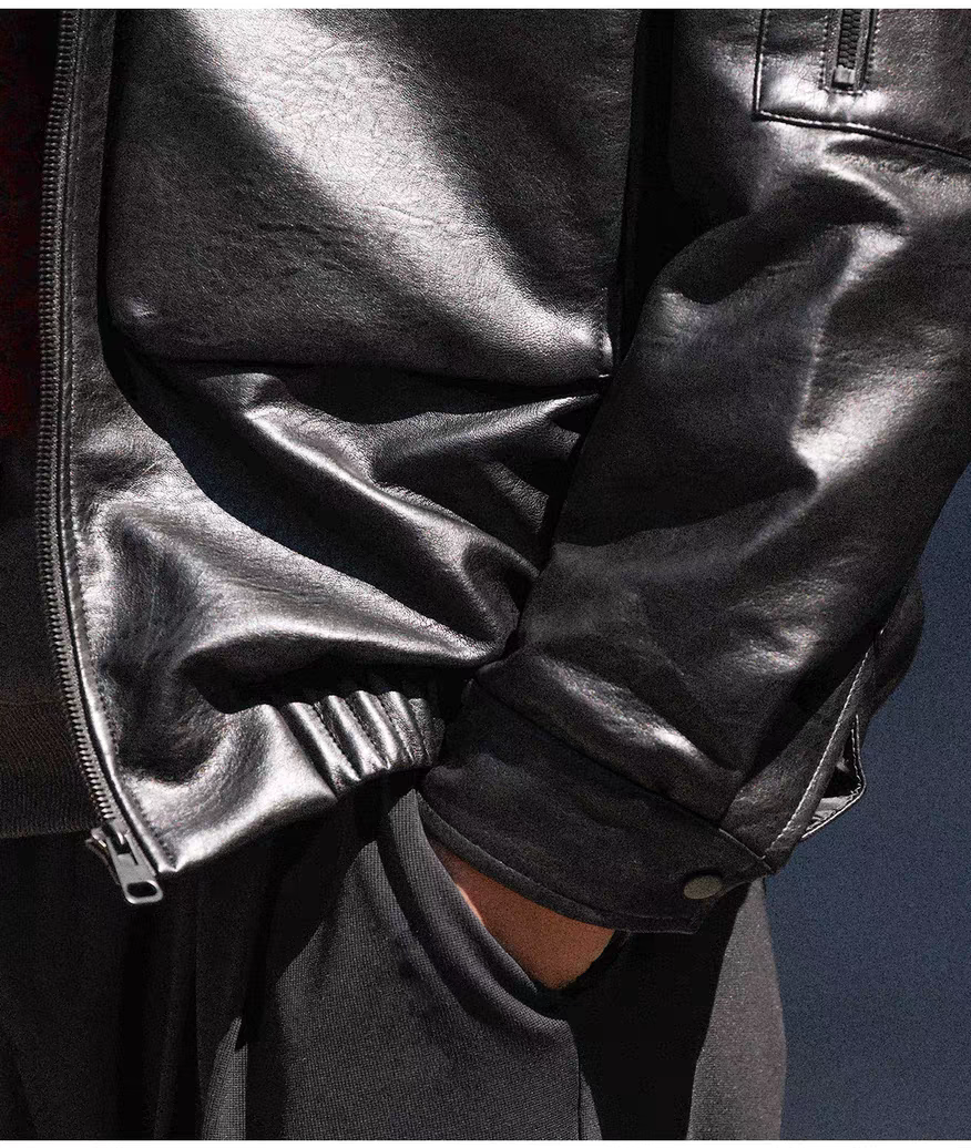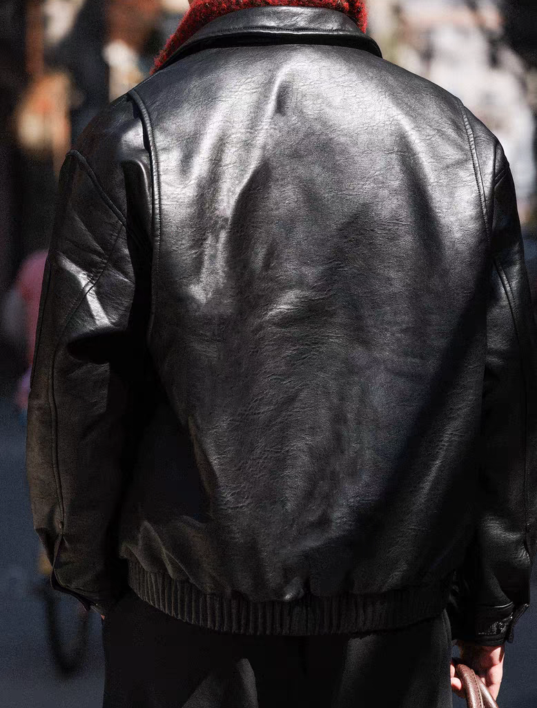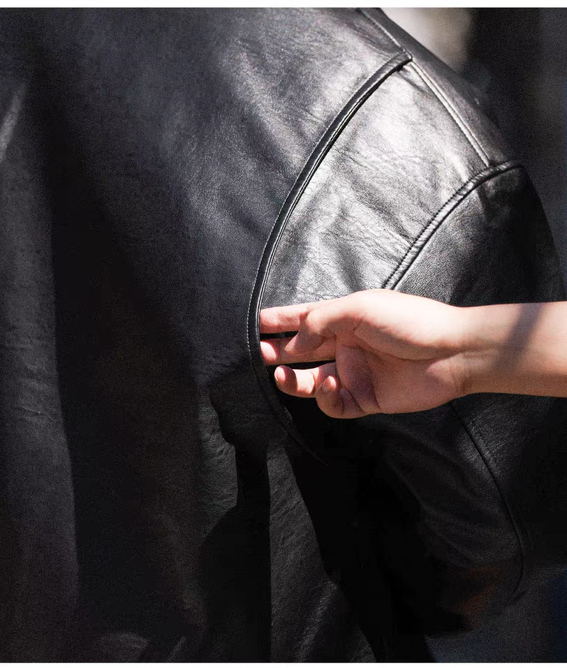 また、ボックスシルエットなのに野暮ったくならず、現代的な都会の雰囲気も漂わせているのがこのジャケットの強み。バイクに跨がる後ろ姿さえ絵になるし、街中でも存在感がスッと際立つ仕上がりです。特に夜の街灯に当たった時のレザー表面の重厚な光沢は、思わず自分でも見返したくなるほど。